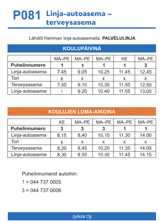 Haminan talviaikatauluvihko 2025–2026 (koko vihko, pdf, 18Mt) päivitetty 20.10. selkeytetty linjan 1 1)-selitettä, 21.8. linjat 1A, 1U ja P076. Muutokset painettuihin aikatauluihin