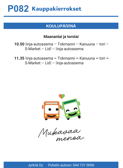 Aikataulut löytyvät alta sekä reittioppaasta että Waltti Mobiili -sovelluksesta.