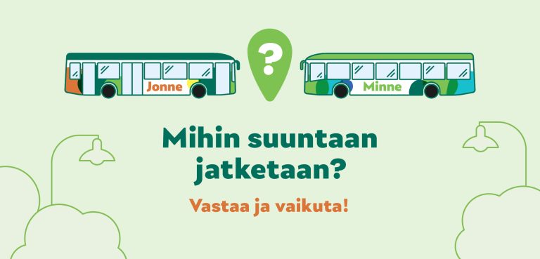 Jonnen ja Minnen tärkein tehtävä on viedä ihmiset perille – ja jotta reissu menee nappiin, on matka suunniteltava yhdessä.Siksi olemme avanneet kyselyn, jossa voit antaa omat ajatuksesi liittyen bussien reitti- ja aikataulumuutoksiin.Vastauksia toivomme erityisesti bussien aktiivikäyttäjiltä, sekä asukkailta, jotka eivät tällä hetkellä käytä joukkoliikennettä. Kyselyssä
